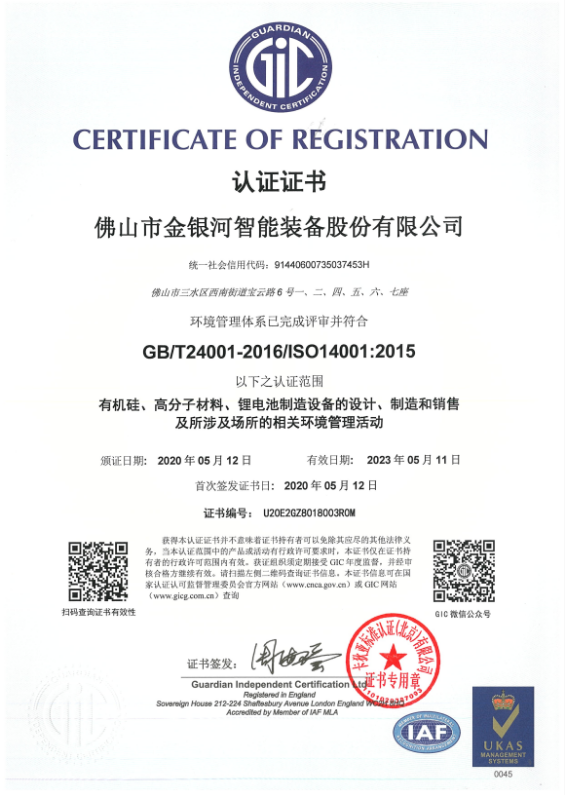 2020年5月,伟德国际victor·1946源自“环境管理体系”完成评审并符合GB/T24001-2016/ISO 14001:2015,认证范围包括有机硅、高分子材料、锂电池制造设备的设计、制造和销售及所涉及场所的相关职业健康安全管理活动。