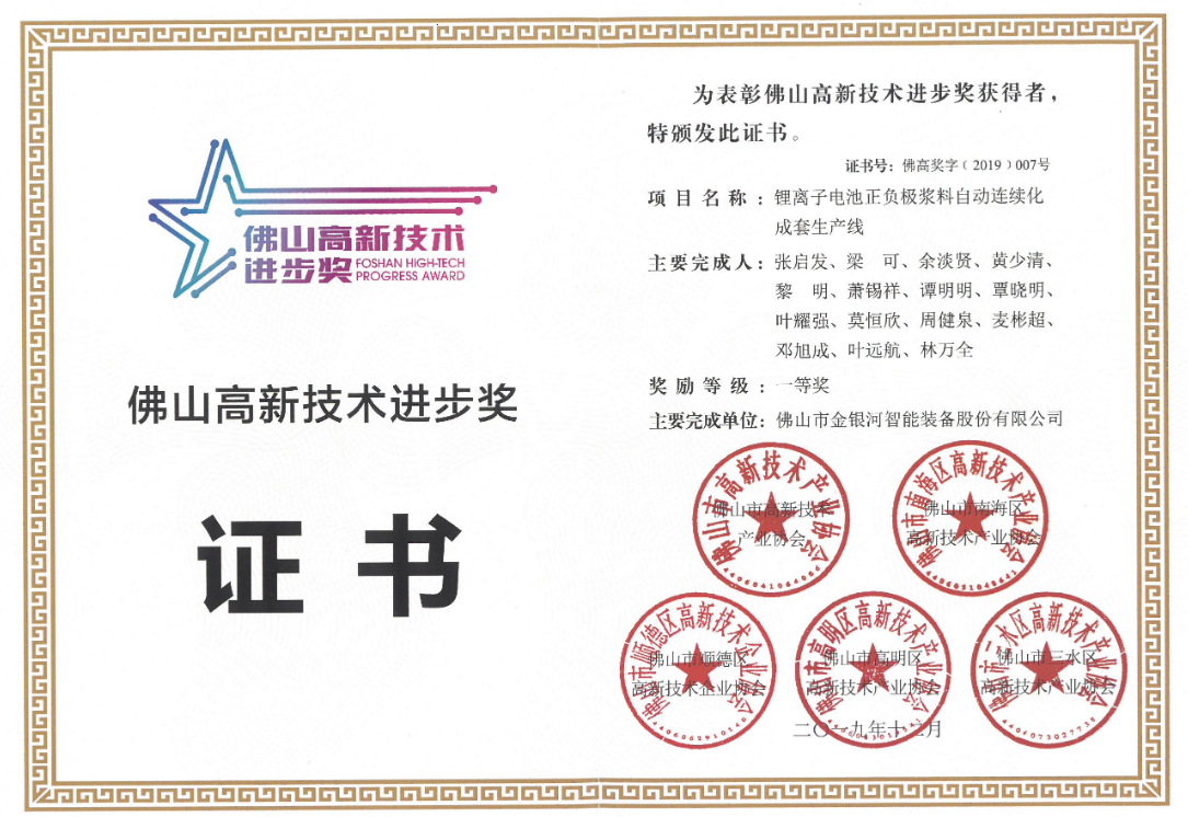 2019年12月,伟德国际victor·1946源自项目“锂离子电池正负极浆料自动连续化成套生产线”被佛山高新技术产业协会授予“佛山高新技术进步一等奖”。