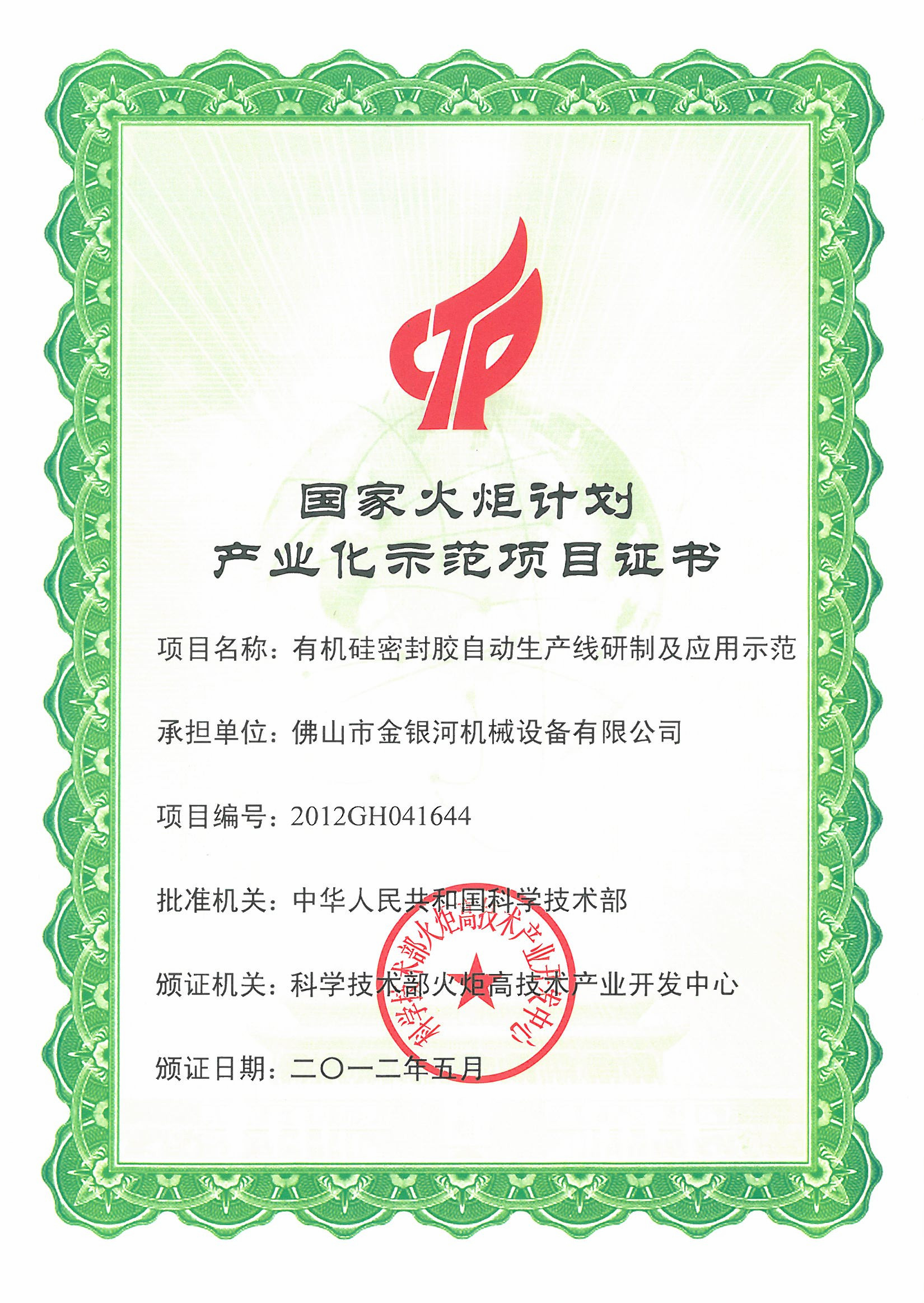 2012年5月,经科学技术部批准,伟德国际victor·1946源自“有机硅密封胶自动生产线及应用示范”项目被列入国家火炬计划产业化示范项目。