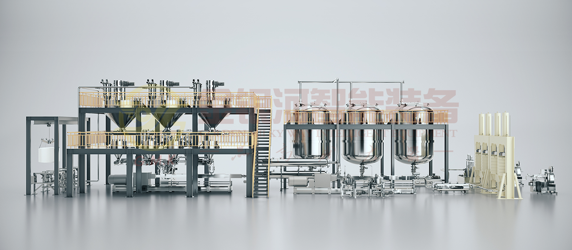 由计量斗、称量及输送系统、贮罐、冷却器、多工位出料机、喂料机、高速预混机、双螺杆螺旋混合机、辅助设备及DCS中央控制系统组成。原材料(粉体与液体)通过精确的计量系统在线自动和连续输送到螺旋混合机中,利用螺旋混合机中的混合、分散、研磨、温控、抽真空等功能满足不同的生产配方工艺,对于建筑胶产品如:脱肟、脱醇型密封胶根据工艺需求作出多种设备调整组合,通过在线加入色浆及助剂至其中。它的生产效率高,适合大规模生产;它具有自动化程度高,杜绝物料直接接触空气,产品质量稳定性好,物料及能源损耗少等优点。
