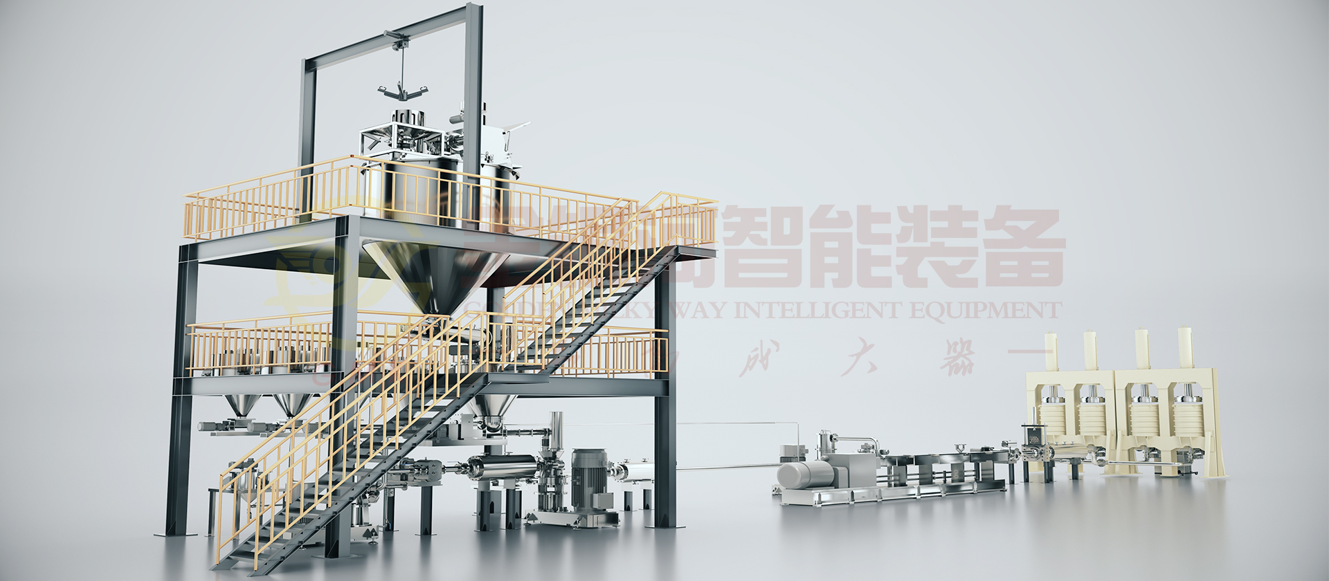 由计量斗、称量及输送系统、贮罐、冷却器、多工位出料机、喂料机、高速预混机、双螺杆螺旋混合机、辅助设备及DCS中央控制系统组成。原材料(粉体与液体)通过精确的计量系统在线自动和连续输送到螺旋混合机中,利用螺旋混合机中的混合、分散、研磨、温控、抽真空等功能满足不同的生产配方工艺,对于建筑胶产品如:中透、酸透型等密封胶根据工艺需求作出多种设备调整组合,通过在线加入色浆及助剂至其中。它的生产效率高,适合大规模生产;它具有自动化程度高,杜绝物料直接接触空气,产品质量稳定性好,物料及能源损耗少等优点。