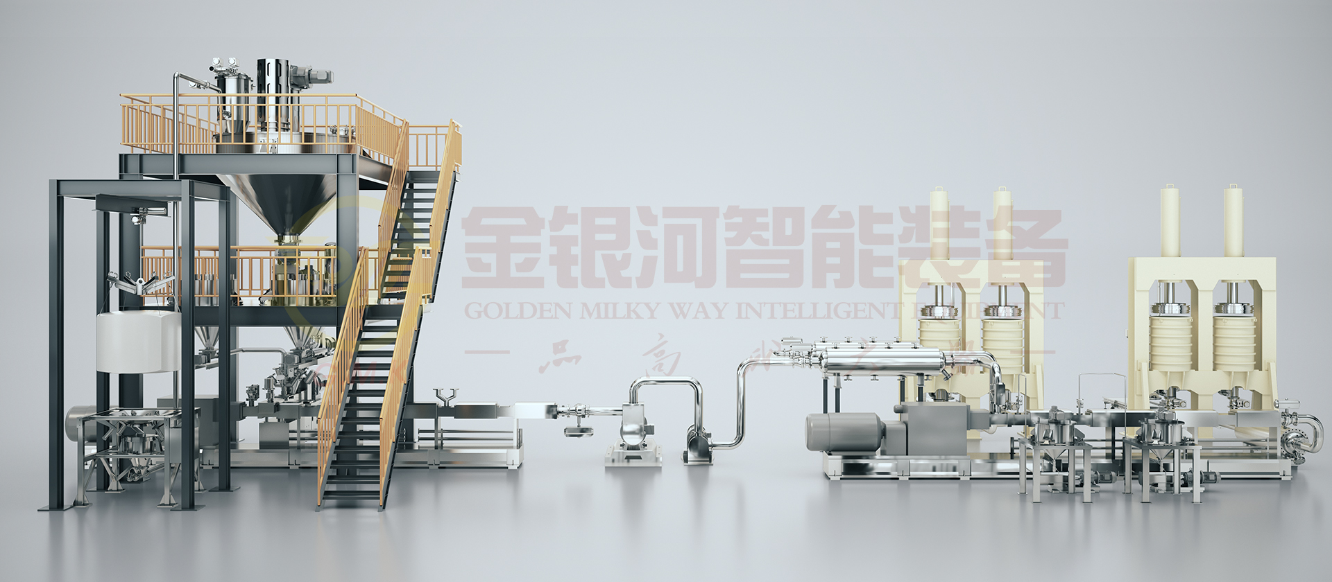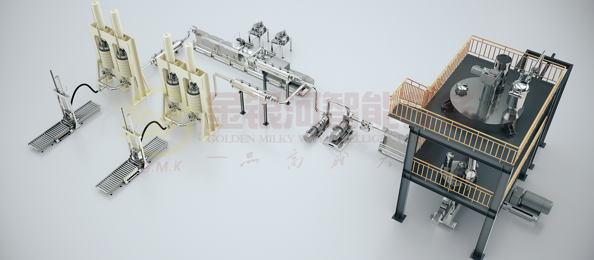 由计量斗、称量及输送系统、贮罐、冷却器、多工位出料机、喂料机、高速预混机、双螺杆螺旋混合机、辅助设备及DCS中央控制系统组成。原材料(粉体与液体)通过精确的计量系统在线自动和连续输送到螺旋混合机中,利用螺旋混合机中的混合、分散、研磨、温控、抽真空等功能满足不同的生产配方工艺,对于建筑胶产品如:脱肟、脱醇型、中透、酸透型、A组分、B组分、色浆等密封胶根据工艺需求作出多种设备调整组合,通过在线加入色浆及助剂至其中。它的生产效率高,适合大规模生产;它具有自动化程度高,杜绝物料直接接触空气,产品质量稳定性好,物料及能源损耗少等优点。