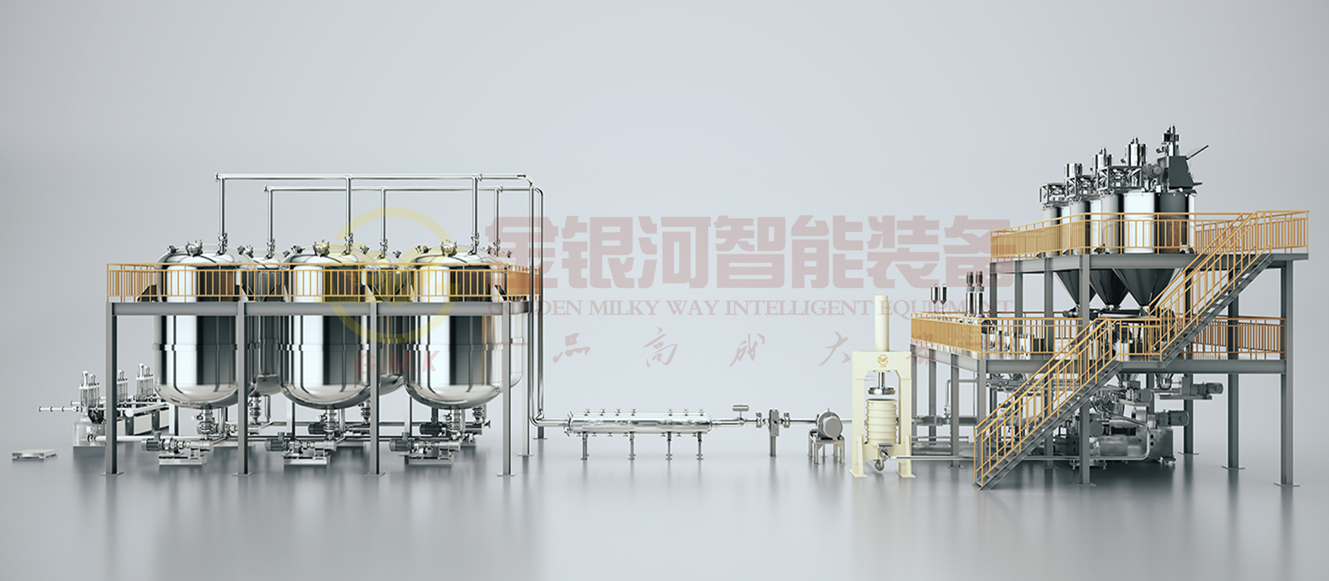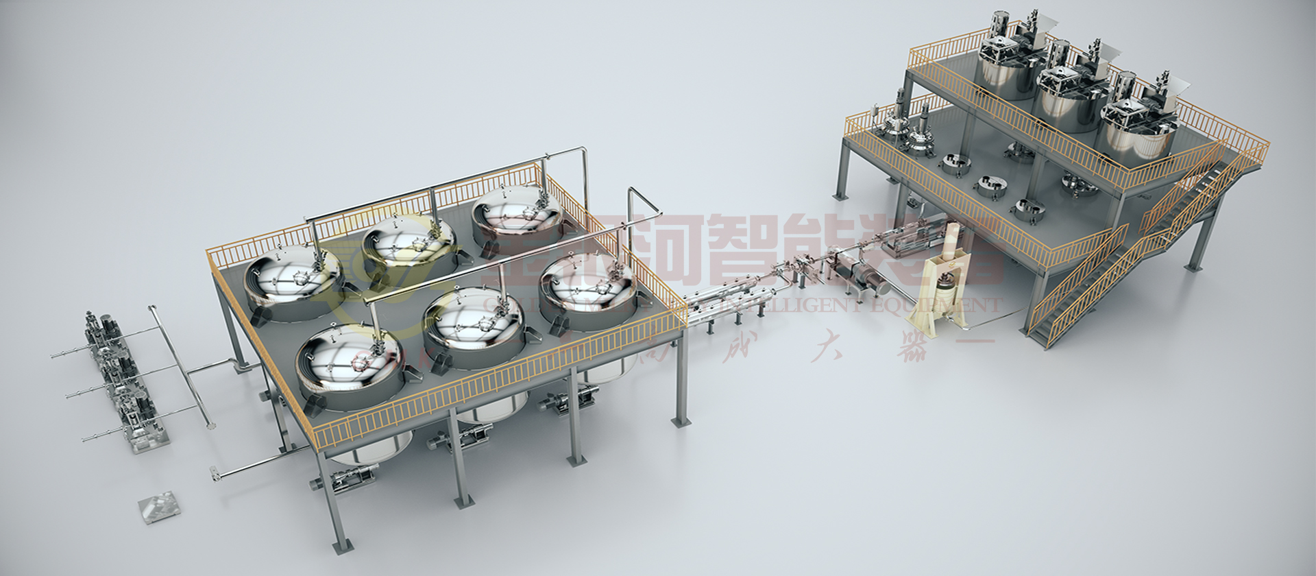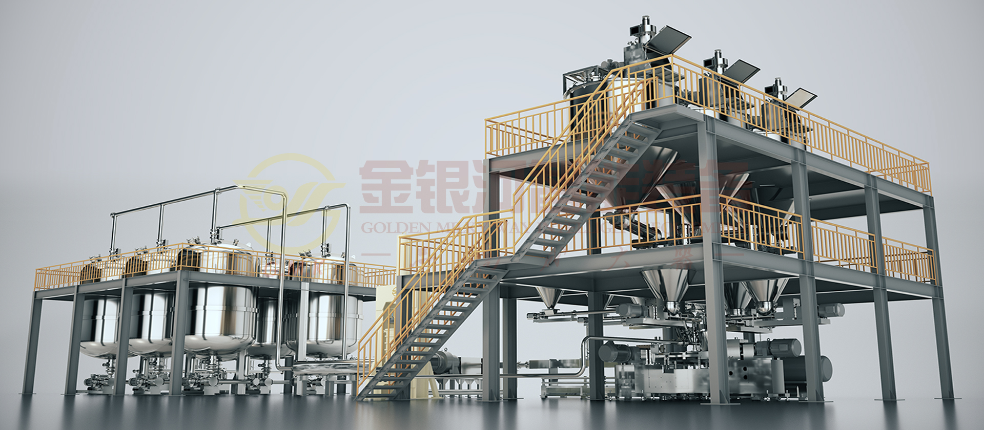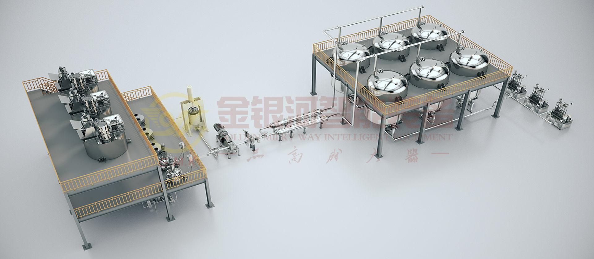 由计量斗、称量及输送系统、贮罐、冷却器、多工位出料机、喂料机、双螺杆螺旋混合机、辅助设备及DCS中央控制系统组成。原材料(粉体与液体)通过精确的计量系统在线自动和连续输送到螺旋混合机中,在一阶双螺杆螺旋混合机中完成粉液完成混合、分散、研磨、抽真空,并通过在线加入助剂至其中,并输出进入贮罐暂存,后段接静态混合机即可完成MS胶产品输出。它的生产效率高,适合大规模生产;它具有自动化程度高,杜绝物料直接接触空气,产品质量稳定性好,物料及能源损耗少等优点。