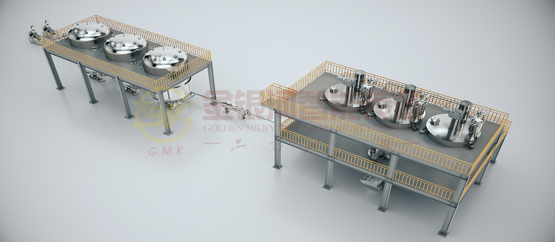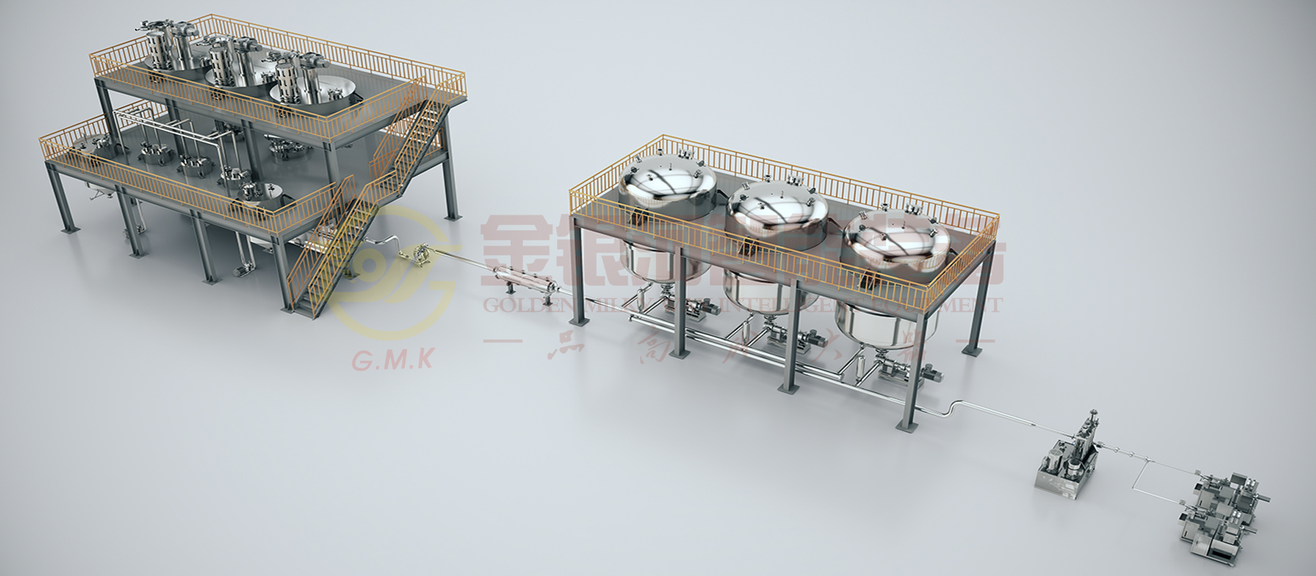 由计量斗、称量及输送系统、贮罐、冷却器、喂料机、双螺杆螺旋混合机、辅助设备及DCS中央控制系统组成。原材料(粉体与液体)通过精确的计量系统在线自动和连续输送到螺旋混合机中,在双螺杆螺旋混合机中完成粉液完成混合、分散、研磨、抽真空,并通过在线加入液料至其中,并输出进入贮罐暂存,后段接静态混合机即可完成双组分电源灌封胶产品输出。它的生产效率高,适合大规模生产;它具有自动化程度高,杜绝物料直接接触空气,产品质量稳定性好,物料及能源损耗少等优点。