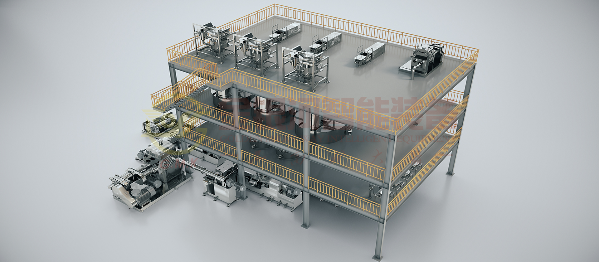 由计量斗、称量及输送系统、贮罐、生胶喂料机、单螺杆预混机、双螺杆螺旋混合机、带挤出功能捏合机、单螺杆输送机,网式过滤器、定型切胶机、辅助设备及DCS中央控制系统组成。高温胶的原材料(粉体与液体)通过精确的计量系统在线自动和连续输送到螺旋混合机中,分三段完成粉液混合,对产能大大提高,产出基料后进入捏合机,抽真空的同时把料挤出到下一双螺杆螺旋混合机进行在线冷却,出口按照要求的包装出料大小定型、切断后包装。它的生产效率高,适合大规模生产;它具有自动化程度高,杜绝物料直接接触空气,产品质量稳定性好,物料及能源损耗少等优点。