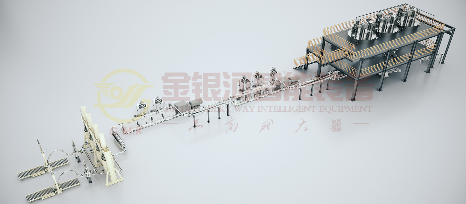 由计量斗、称量及输送系统、贮罐、冷却器、多工位出料机、喂料机、增压泵、网式过滤器、双螺杆螺旋混合机、辅助设备及DCS中央控制系统组成。光伏的原材料(粉体与液体)通过精确的计量系统在线自动和连续输送到一阶螺旋混合机中,在一阶螺旋混合机中完成混合、分散、研磨、抽真空等产出基料后进入二阶螺旋混合机再到三阶螺旋混合机,通过在线加入色浆及助剂至其中,完成混合、混色、分散、研磨、抽真空等完成品料制作并输出进入多工位出料机暂存,多工位机出料机轮流交替出料过滤包装。它的生产效率高,适合大规模生产;它具有自动化程度高,杜绝物料直接接触空气,产品质量稳定性好,物料及能源损耗少等优点。